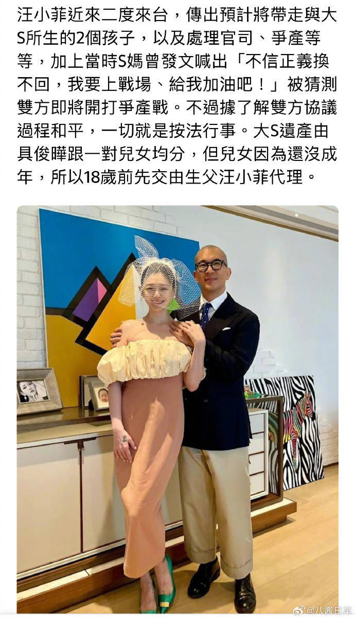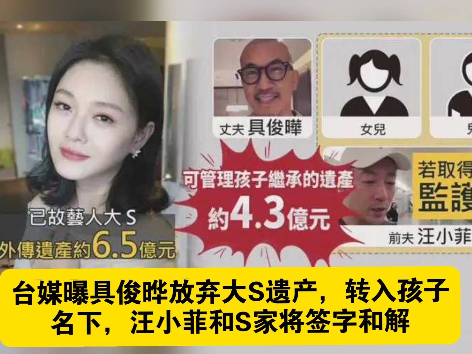 按照法律规定,大S的现任丈夫具俊晔本应与两名子女均等分割遗产,依法可获得约三分之一的资产份额。但具俊晔已于年初完成公证流程,自愿签署文件放弃全部法定继承权利,将自身应得份额无偿让渡给两名子女,使得大S遗产实现100%由子女继承。友人透露,具俊晔后续计划配合完成遗产继承全部手续,通过信托制度对资产进行规范化管理,核心目的仍是保障子女长期利益。