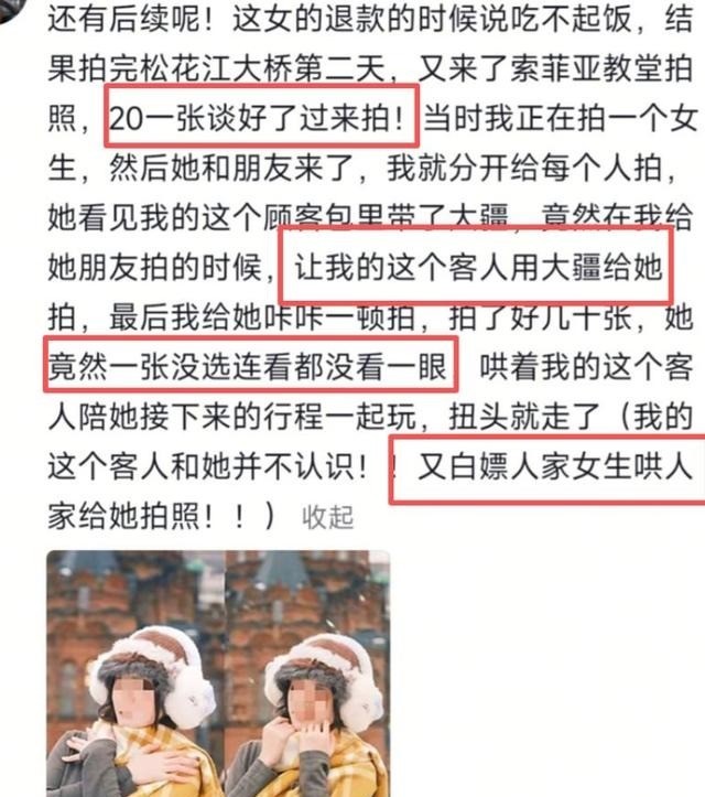 更过分的是,拍完照第二天就有另外一位摄影师再次遇到了这名女生,不过这次女生白嫖的不是摄影师,而是前来旅游的游客。