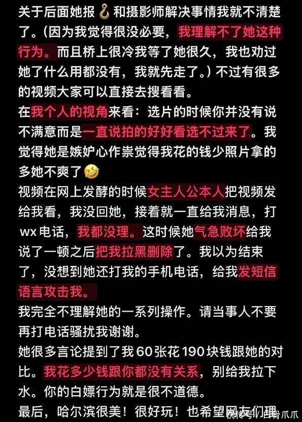 万万想不到,女生去哈尔滨旅游,拍照仅退款事件竟然还有后续!近日,一名女生在哈尔滨白嫖摄影师拍照的事闹得沸沸扬扬,据知情人透露,这名女生也刷到了视频。
