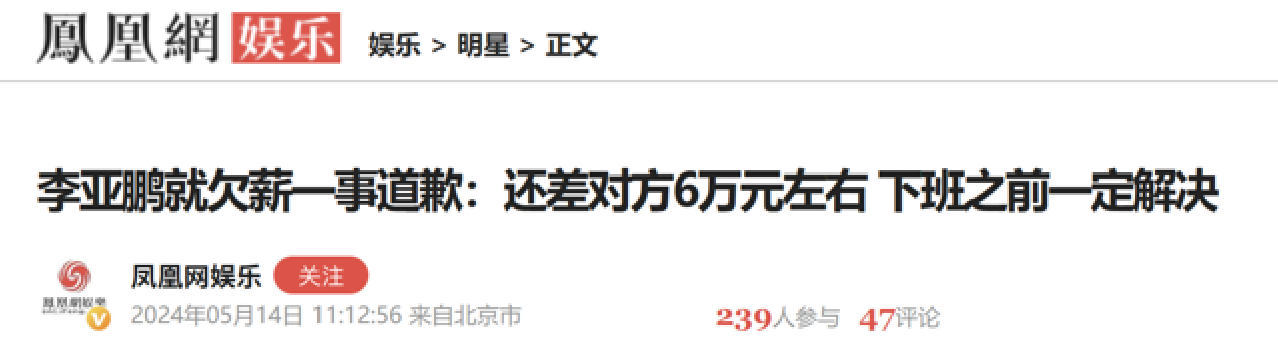 不知道这算不算躲债的一种方式,但后续李亚鹏确实上了被执行名单,也确实因为6万元被员工闹到了网上,让他不得不火速上线挽尊,可见东山再起这场戏并不是谁都能唱明白的。