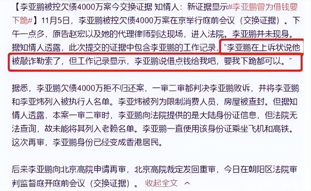 所以李亚鹏只能含泪背起4千万的债务,但借钱的时候下跪求饶,还钱的时候就变成了“拒不归还”。