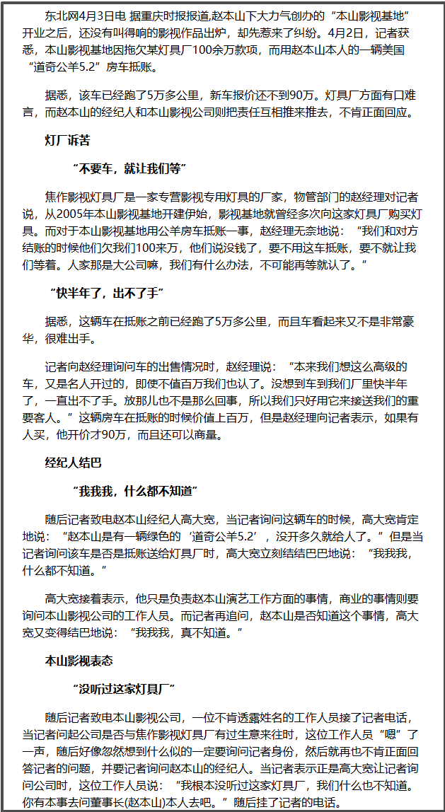 2007年4月初, “赵本山买灯不给钱,用旧房车抵消100余万元欠款”的消息突然铺天盖地。