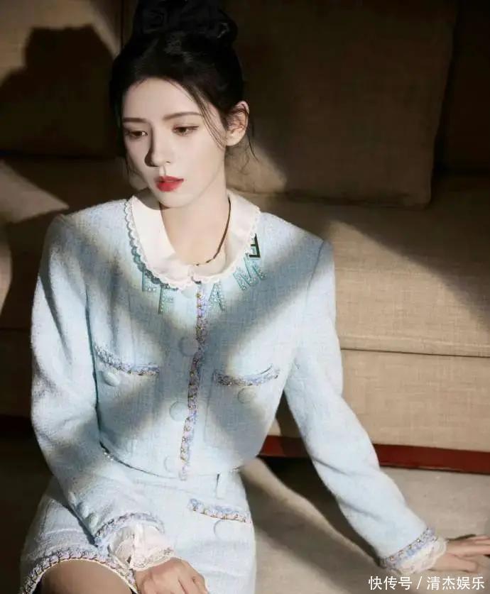 来看她选的这身浅蓝色小香风套装,真心不得不夸一句,太会穿了。白色娃娃领和蕾丝花边敲甜,甜到齁的那种;上半身的短款西装外套,又扳回了一点精致贵气,完全不死板。再配上同色系短裤,露出纤细长腿,妥妥的贵气精灵。衣服上那些彩色线条和珠饰别看不起眼,离近了才发现太讲究了。不刺眼、不显俗,尽显低调华丽,完全是会穿人的必备法则。但最绝的还是那个黑色大蝴蝶结发饰,根本是全身造型的点睛之笔。别看蝴蝶结只是个小配饰,随便一戴,比如高高盘起发髻或者半扎肩发,直接气场变了!本来浅蓝套装已经够优雅贵气,这蝴蝶结一加,那种又复古又甜美的氛围瞬间出来了。配上张予曦标志性的精致妆容,尤其是那一抹亮眼的红唇,简直像是从油画里走出来的名媛。有人说这是把二次元公主风直接穿到现实,这话真不算夸张。